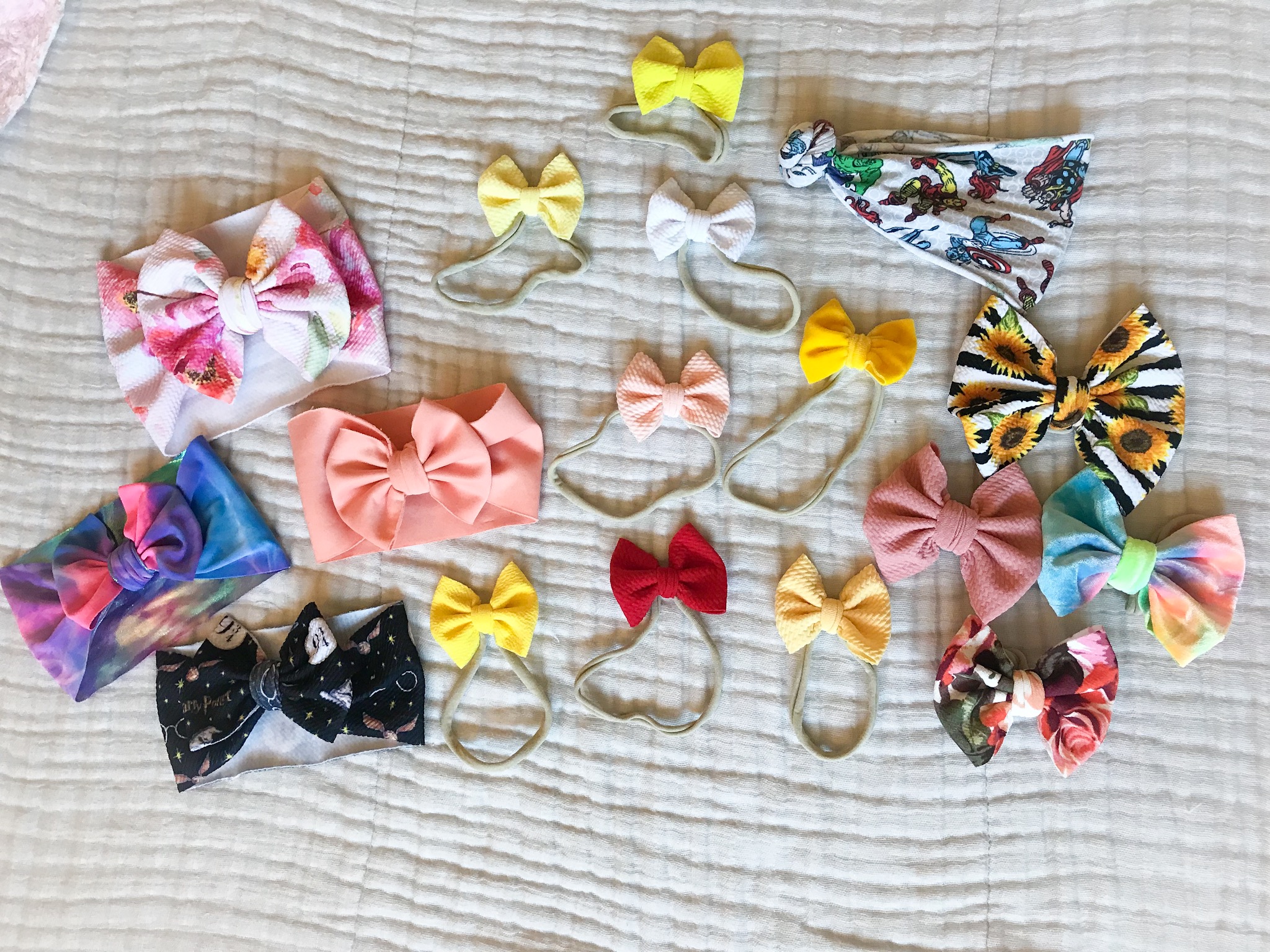 Headwraps are super fun, and there are many types of fabrics that can be used for them. Bullet, knit, velvet, etc. The way each shop ties them will vary, naturally, and each person will have a style preference. Be careful in choosing a retailer who’s goods wont just come apart due to a little tugging, babies do like to pull on their bows.
